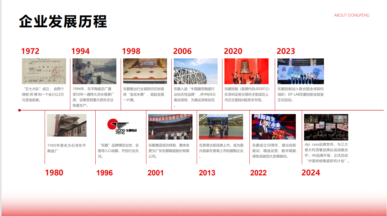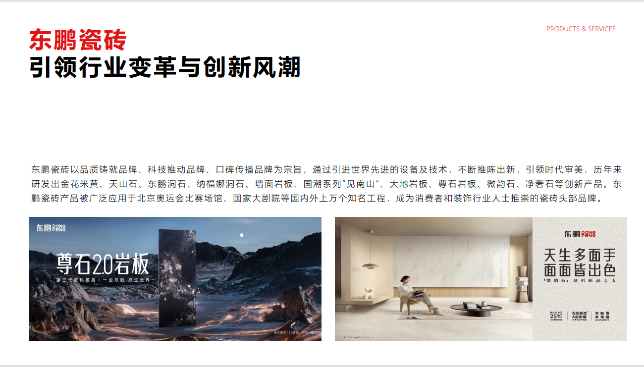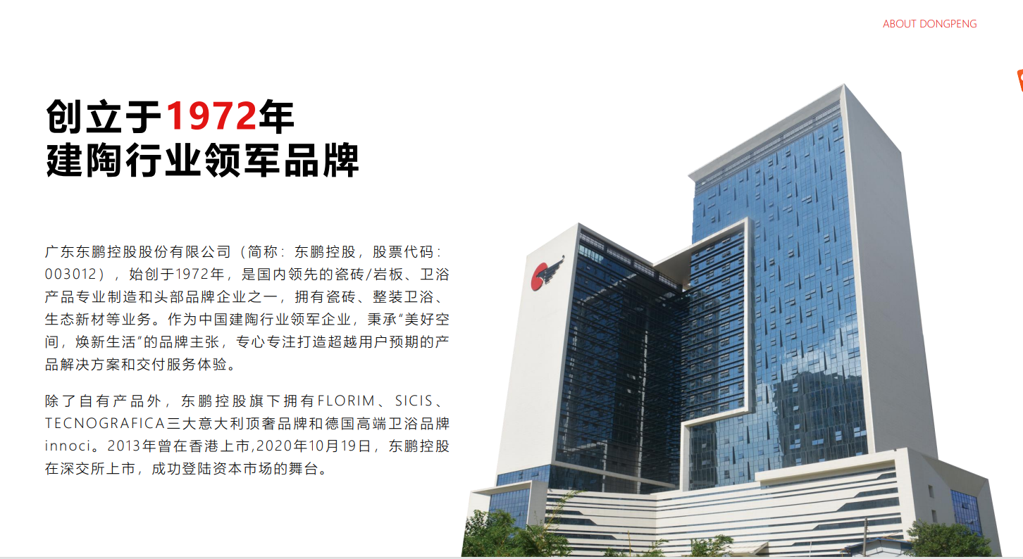 东鹏瓷砖始创于1972年,54年的品牌历程,中国建陶领军品牌。注重品质及性价比!我们有最专业的销售团队,设计团队,为每位客户提供高效的优质服务,让您的选砖省事、省心、省力。