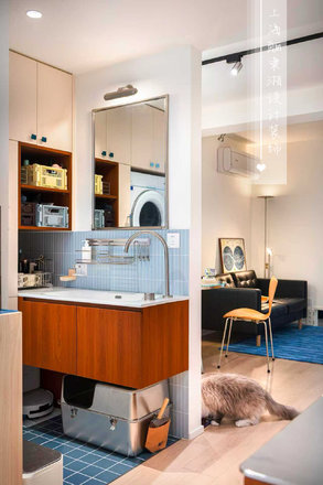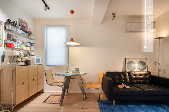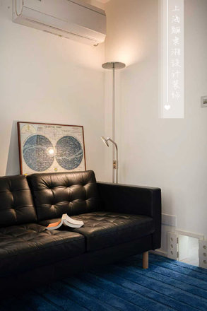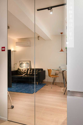 套内面积:37㎡ 户型结构:一房一厅一厨一卫 设计风格:包豪斯现代主义 特色元素:黑色皮质沙发、克莱因蓝点缀、全屋木地板、LDK布局、整墙床尾柜