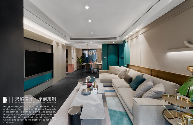 在软装的形状,颜色,图案等选择上也是充分遵循孟菲斯冲突及戏剧化的主题,沙发及地毯,茶几几何形状感都很强,主色为香槟色,并且有孔雀蓝单品进行点缀及与墙面的整体呼应。