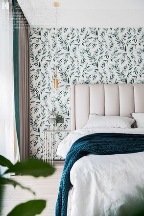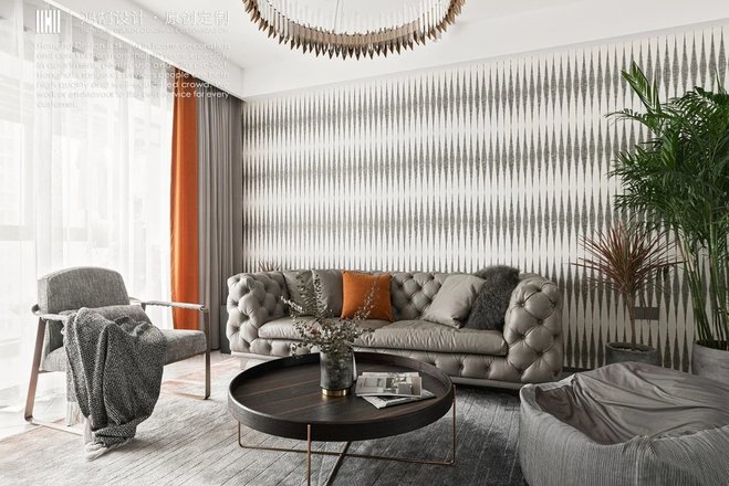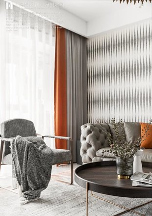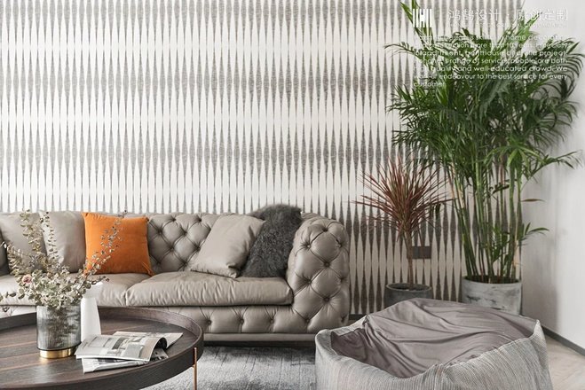 大面积的浅灰色线条状墙纸作为沙发的背景墙,墙纸的纹理和质感,让空间具有生活气息。空间中以深浅相交,让四季的颜色在客厅中蔓延,既丰富又生动。