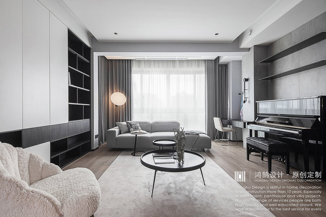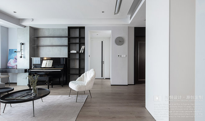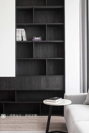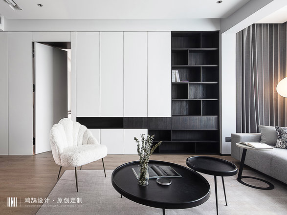 客厅以黑、白、灰为主色调,配以原木色地板相呼应,每一处角落都传递着自由、灵动且舒适的空间感。客厅墙体一面呈错落有致的大书柜为主,关门是一面高冷的背景墙,打开后则是小型家庭图书馆