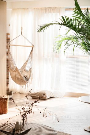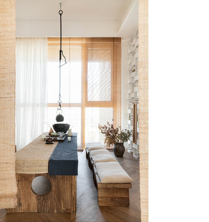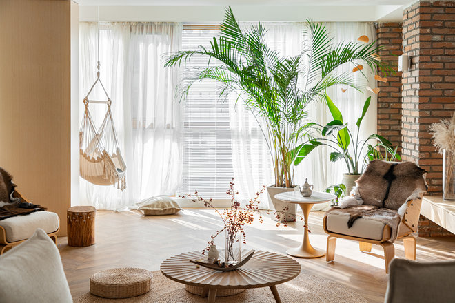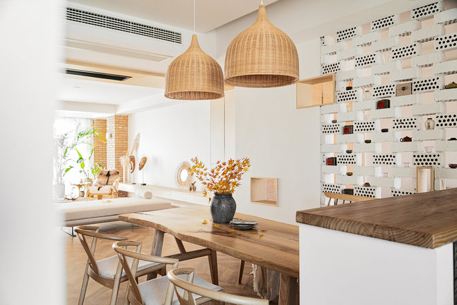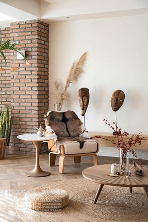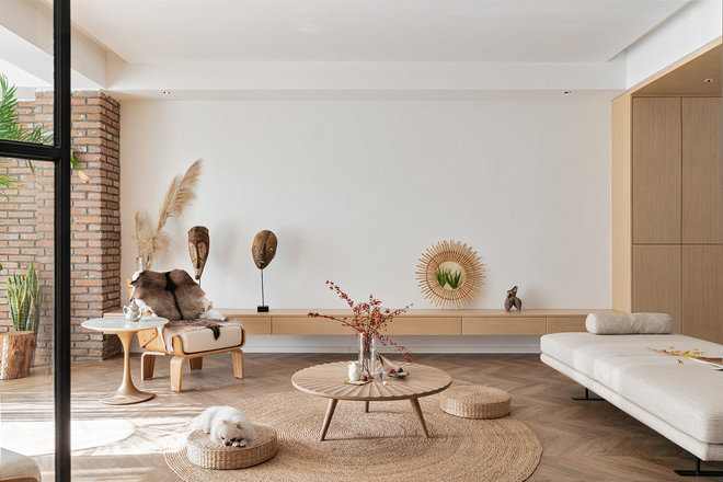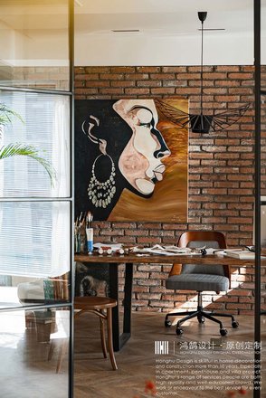客厅业主选用了投影,所以没有电视机,整个客厅主要以空间对话休闲为主,在客厅和阳台之间的过度上面,设计师运用文化砖上墙,增加了自然感和质朴感,同时也是业主喜欢的一些元素。