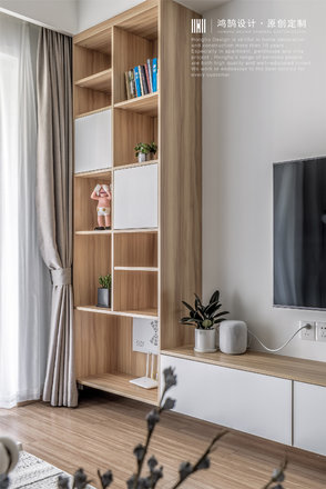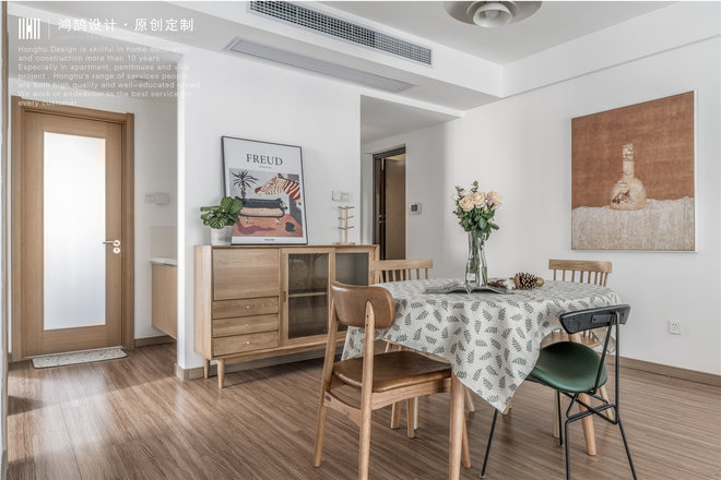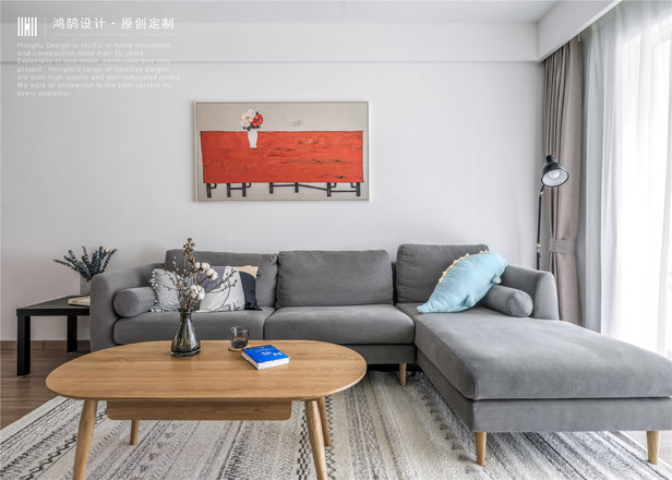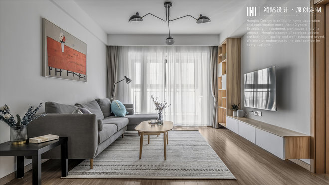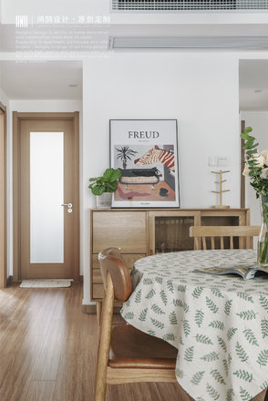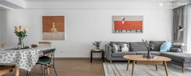 整个空间通铺年轮风格的地板,色调年轻,摸上去会有木纹的肌理感,北欧中不乏日式风质感。客厅沙发背景墙选择了留白处理,可以很好的避免空间产生局促感。