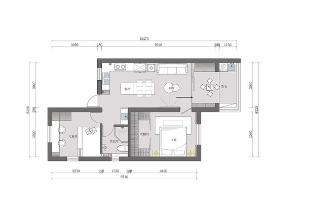 旧房改造,格局调整。改变主卧方向解决储物和卫生间过小问题;阳台纳入客厅,打造休闲瑜伽空间。