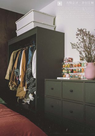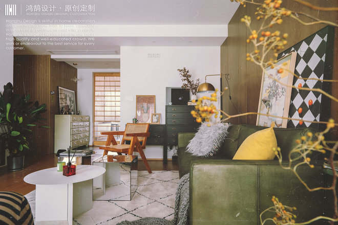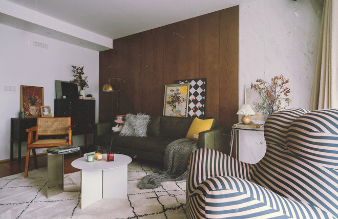 在与女主不断沟通确认风格意向的过程中,其参考的一款evitahome橄榄绿皮沙发引起了设计师的注意,通过提炼发现复古、做旧是她喜欢的元素,从沙发开始展开了一系列联想进行软装方向选择