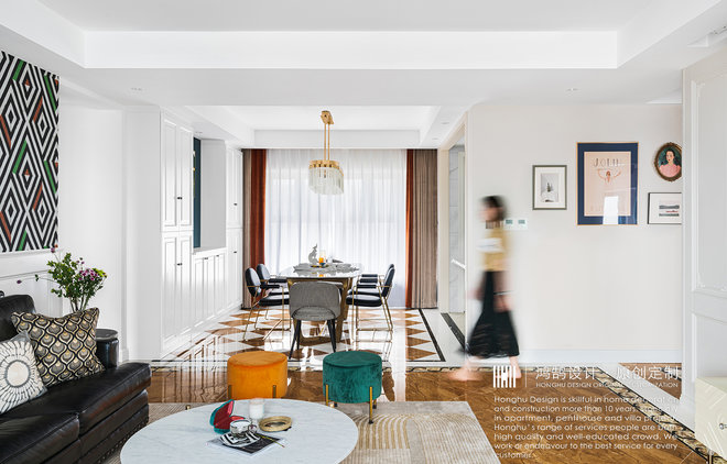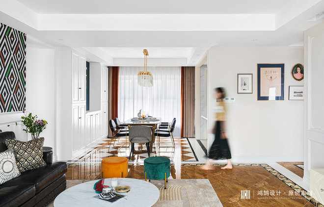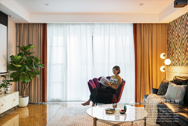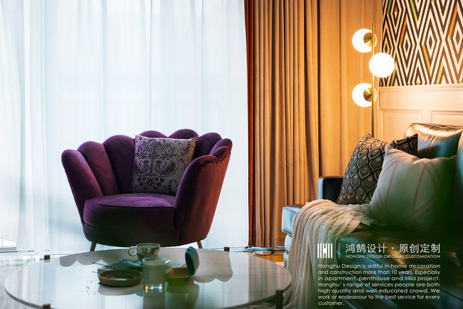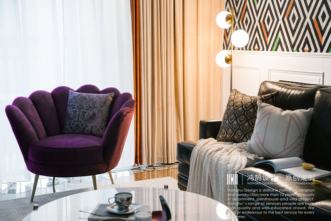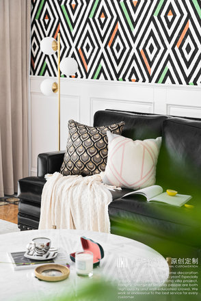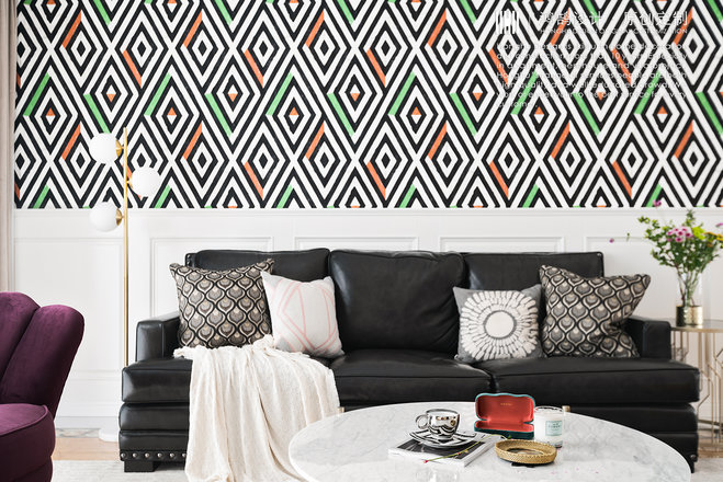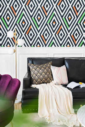 步入客厅,沙发背景墙设计利用局部的木饰面和不规则菱形墙纸,拉伸空间纵向延伸感,酷黑和深邃紫色的搭配,