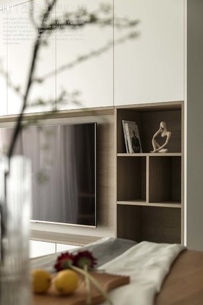 本案是精装房改造项目,原空间偏新中式,在日式配色上降低饱和度,将客户喜欢的日式风格调整成浅色原木北欧