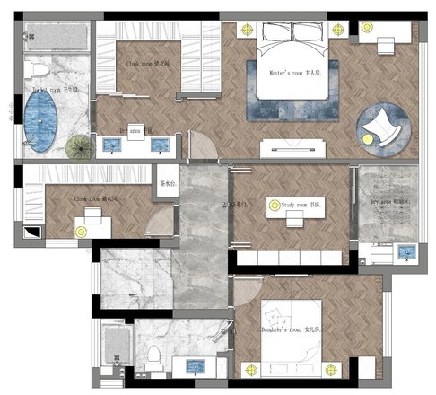 • 设计理念:一楼设置了客房,二楼分别设计成了东西两个套房的形式,把中间带阳台的空间设计成公共的书房和女儿衣帽间