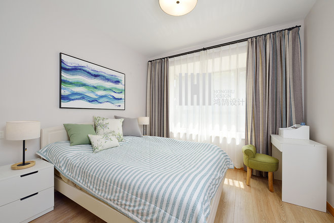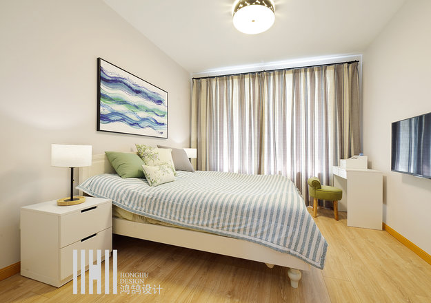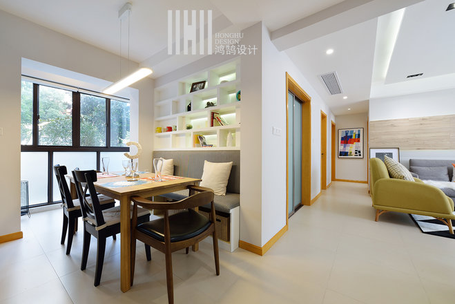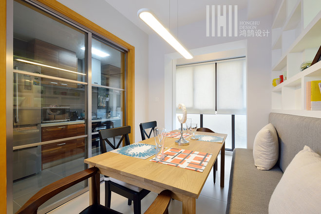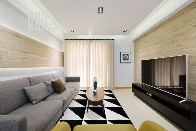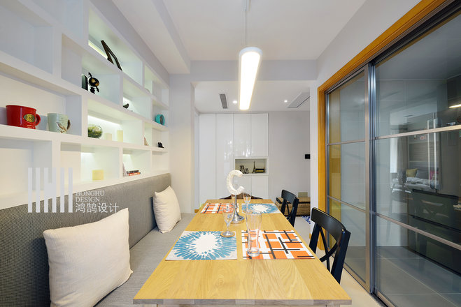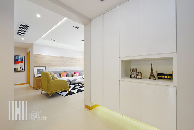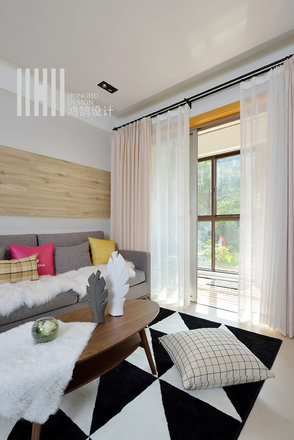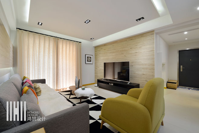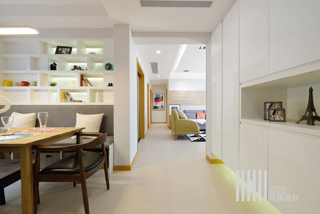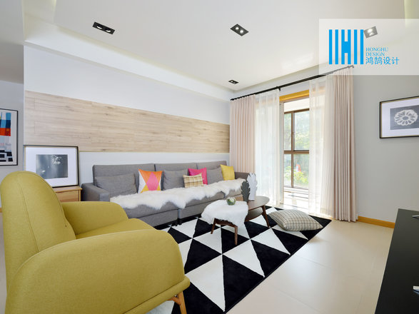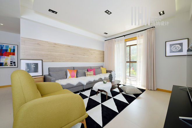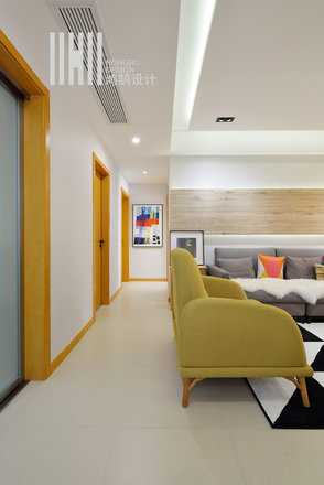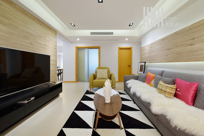 扩大了客厅的视觉面积,跳跃的家具颜色和硬装,轻松的气息扑面而来
