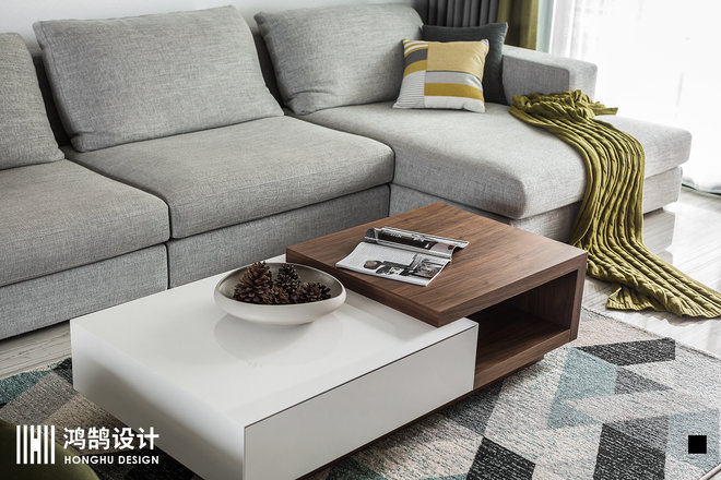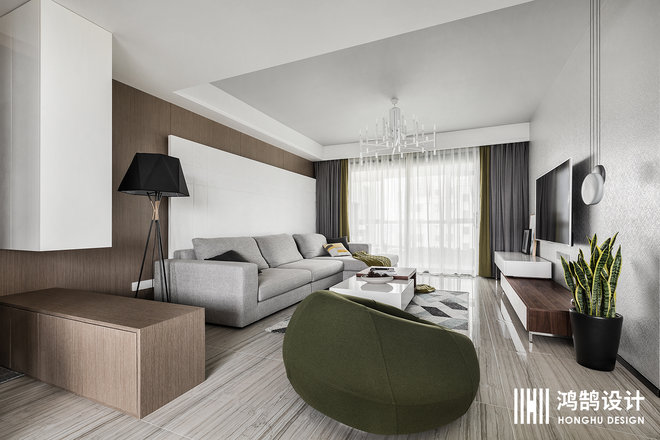 黑白灰的主体调调,加上那一抹清新的森林绿,阳光洒在通透的地砖上,让整个客厅即明亮又不失温度。