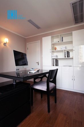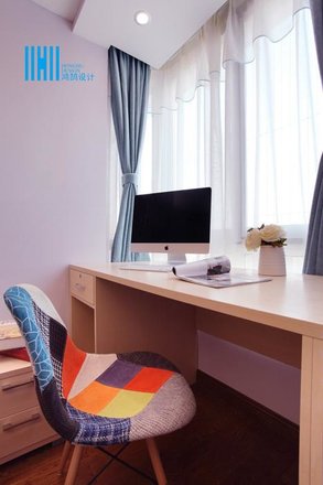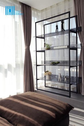 原电视背景处有很粗的承重墙体,对于背景来说很不理想。设计师大胆现场制作电视柜,与那段承重墙融为一体,使客厅整体丰满许多。阳光下的展示架,充满着光影的现代感。