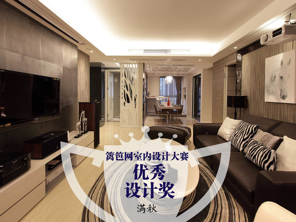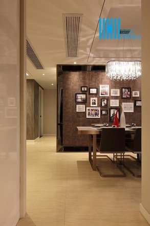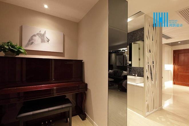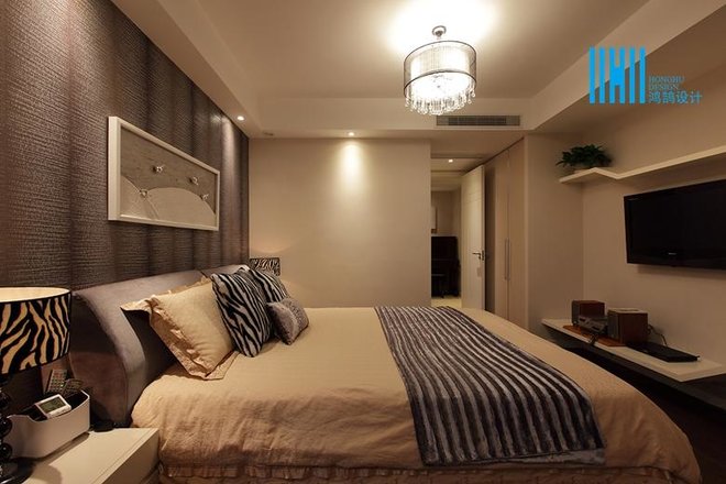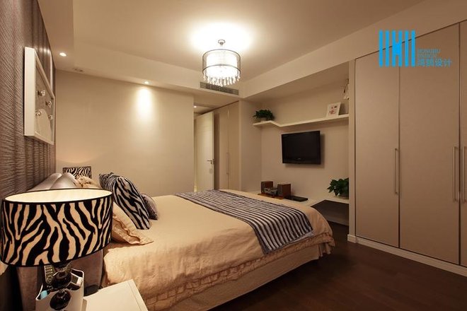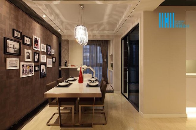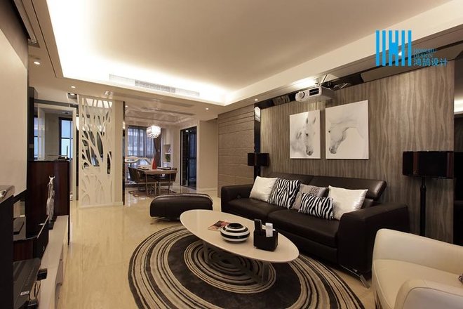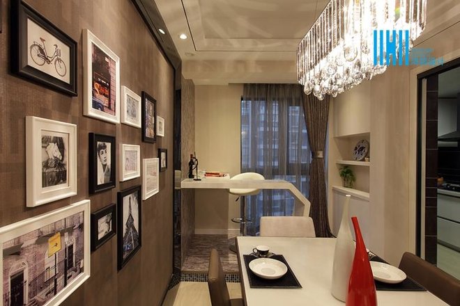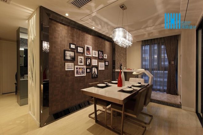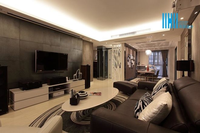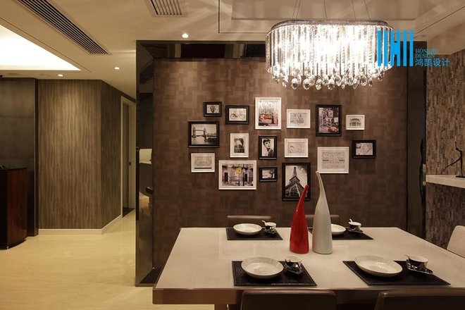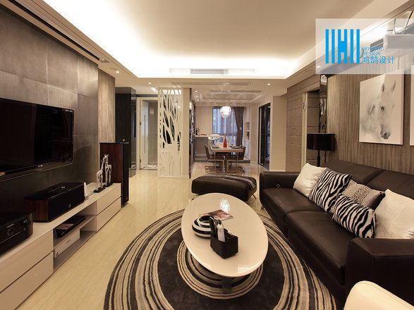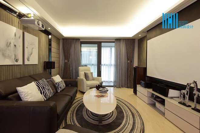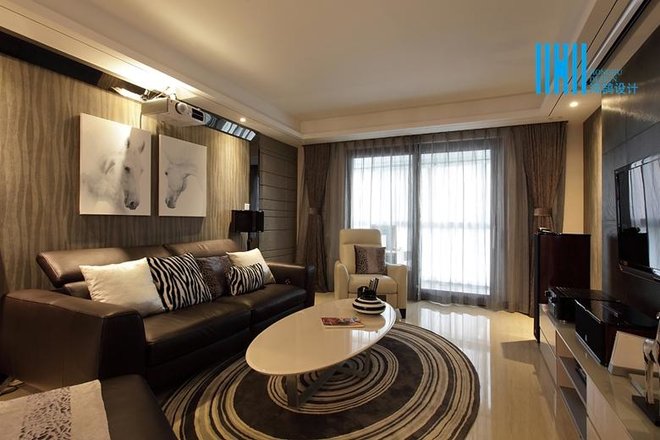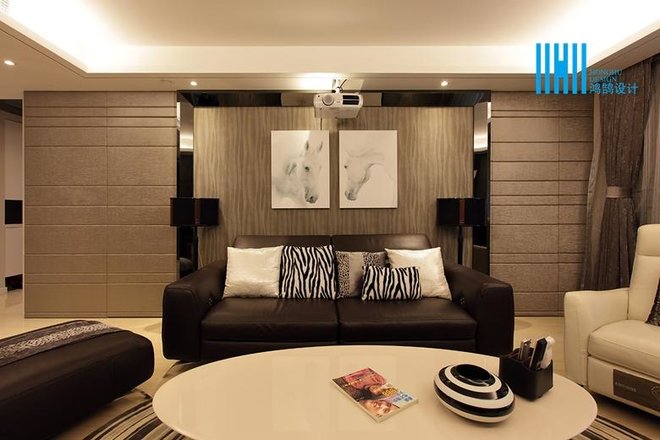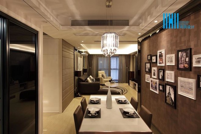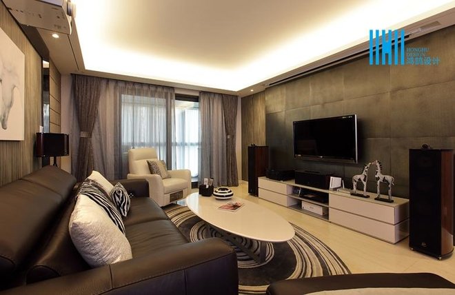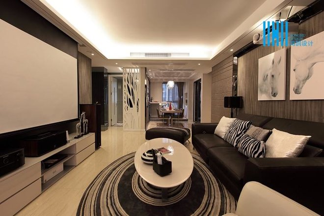 厅的整体性是本案的亮点,用装饰线条、墙纸、电视背景墙以及隐性门来延续整体风格。