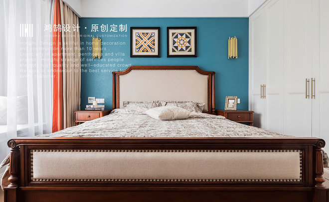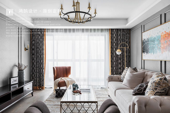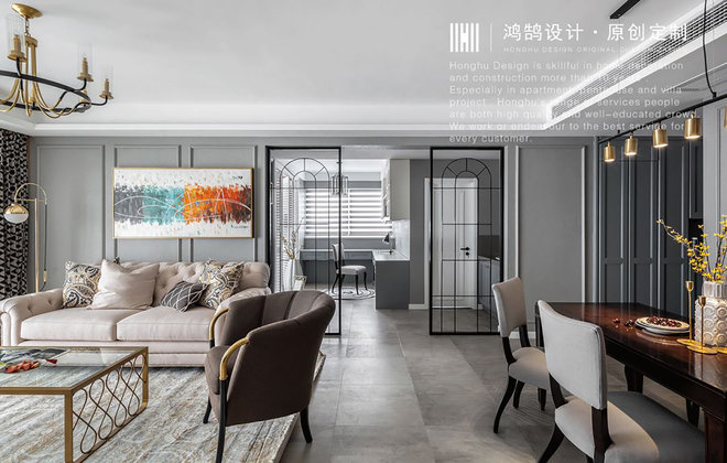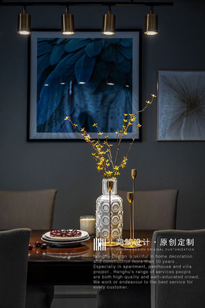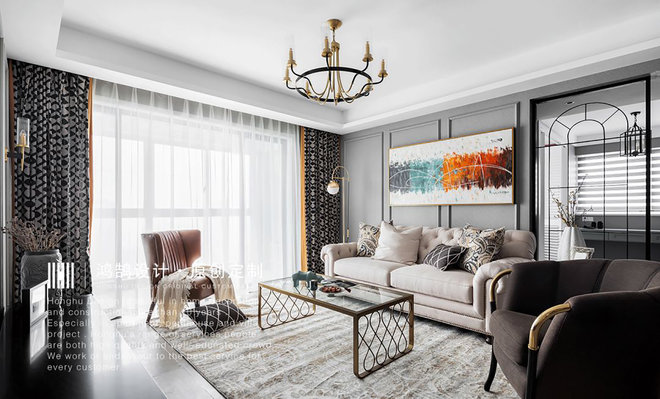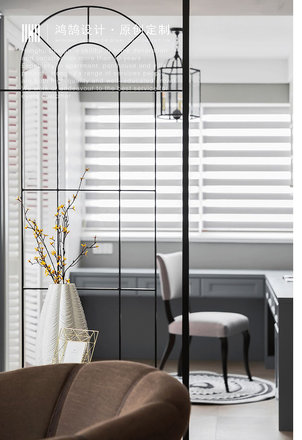 整个空间一眼看过去,有很多线条在里面,用线条与金属质感的软装点缀空间,给予空间品质,加上沙发的柔软布艺材质,又丰富了空间的柔美性,材质与颜色的完美融合使空间散发静谧与优雅的气息。