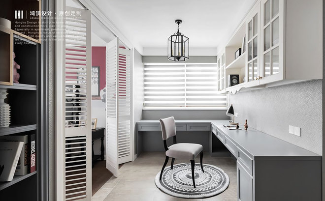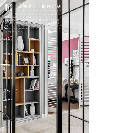 设计师根据业主生活需求,将原先次卧的门朝北移动,同时将北边房间的墙面敲掉,在这里设计了一个敞开式书房