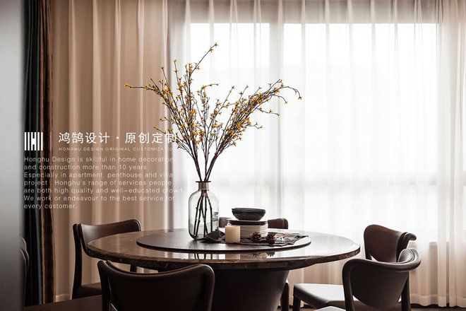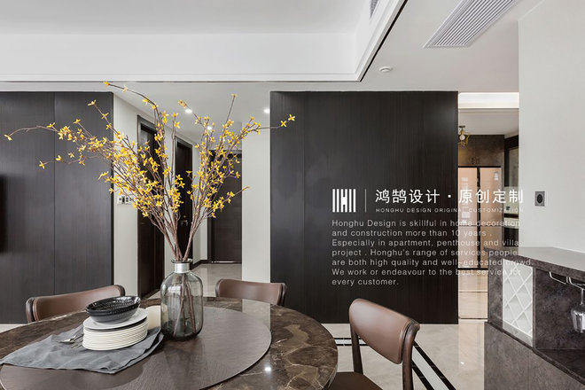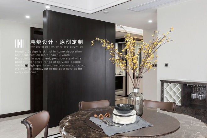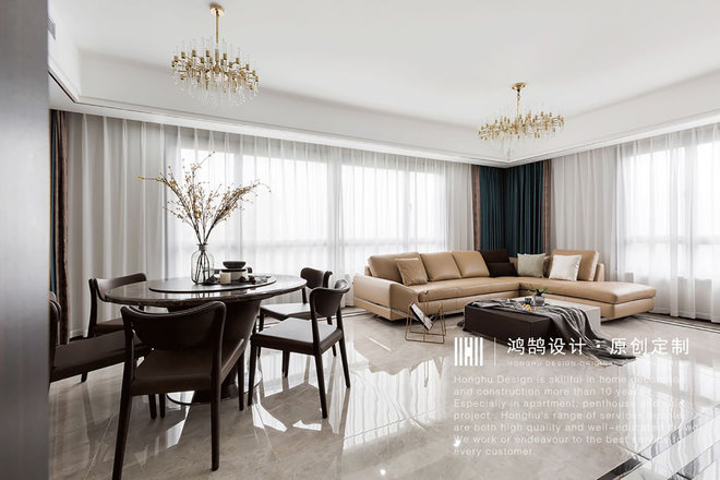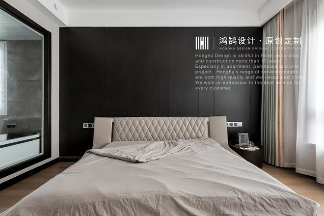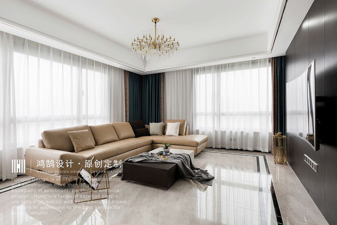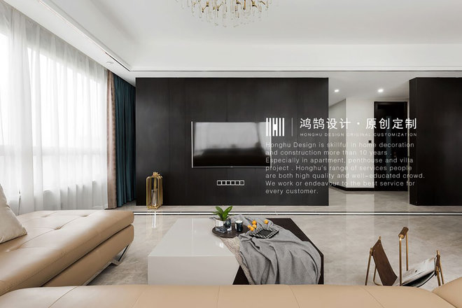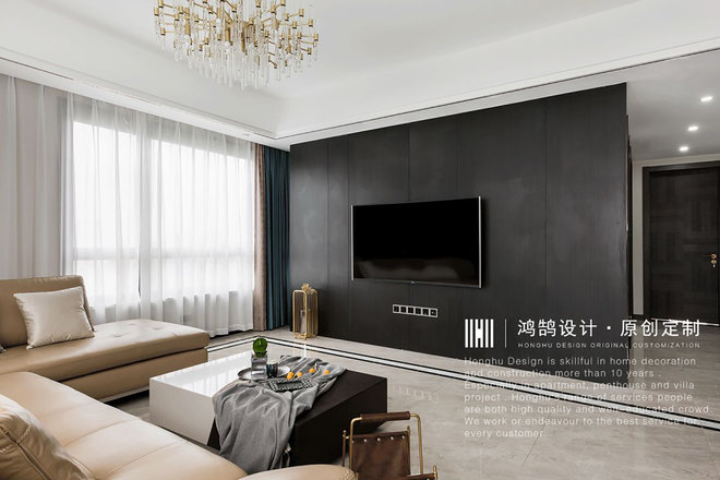 设计师以奶茶色这样低饱和度的色系,打造出简雅柔和的空间韵调,为日后的生活场景留足想象与施展的余地。大胆的使用黑色作为电视背景墙,让空间的层次更加丰富。