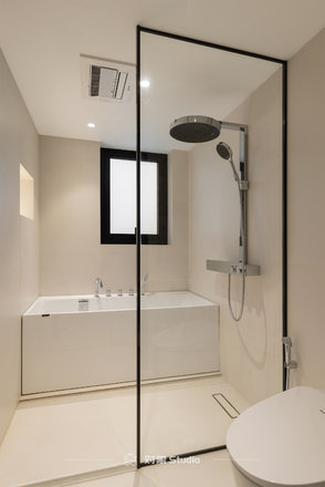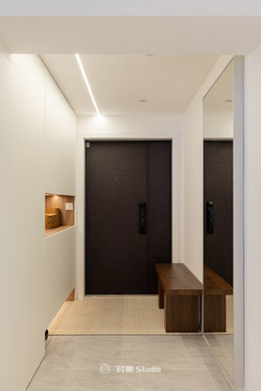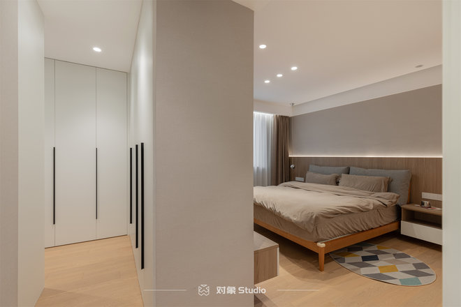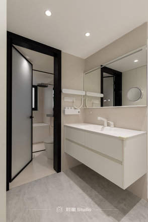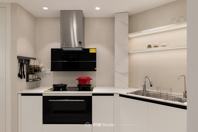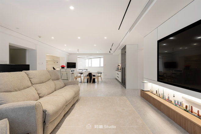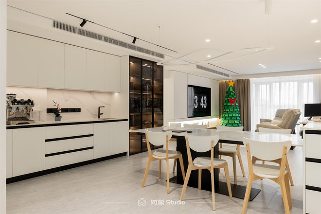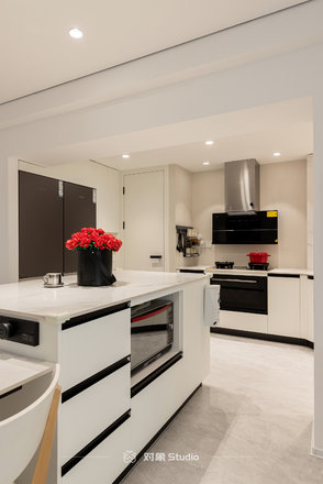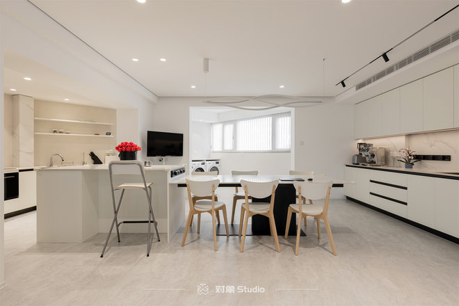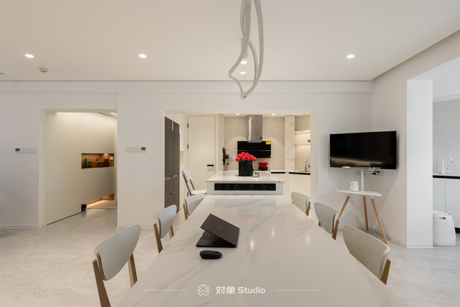 追求视觉上的开阔感: 1.利用大平顶吊顶+筒灯灯光分布来加大空间开阔感 2.餐厨区做好收纳,避免杂乱