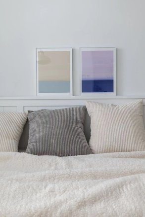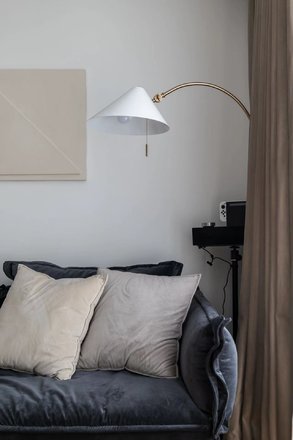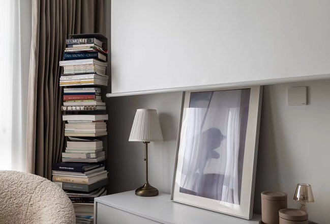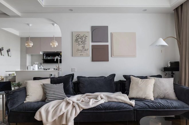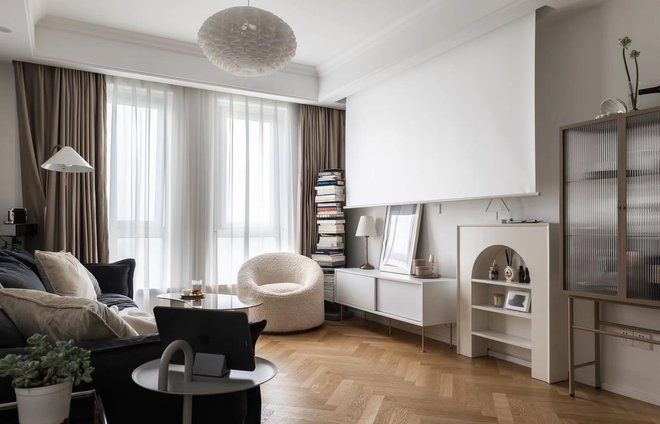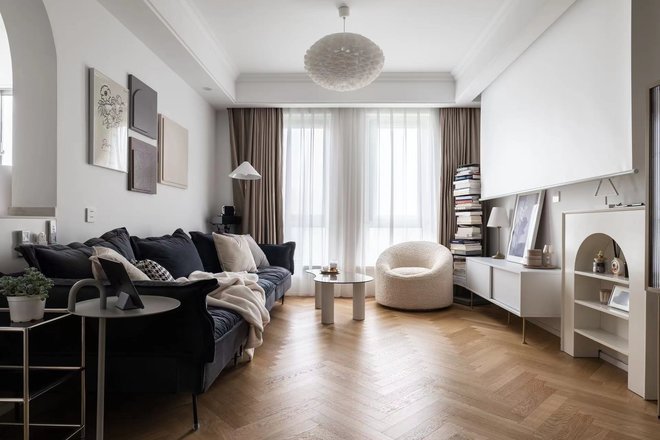 不规则茶几,白色电视柜,低饱和度的墙面装饰画,丝绒质感的沙发,奶油色圆椅与金属置物架也赋予空间更多的质感。