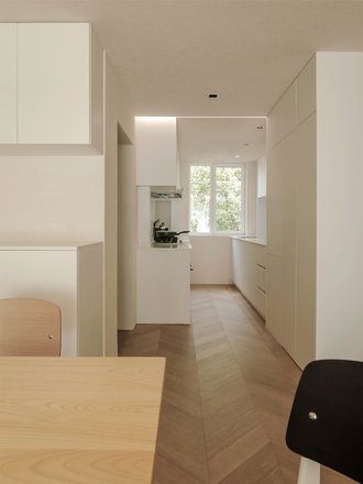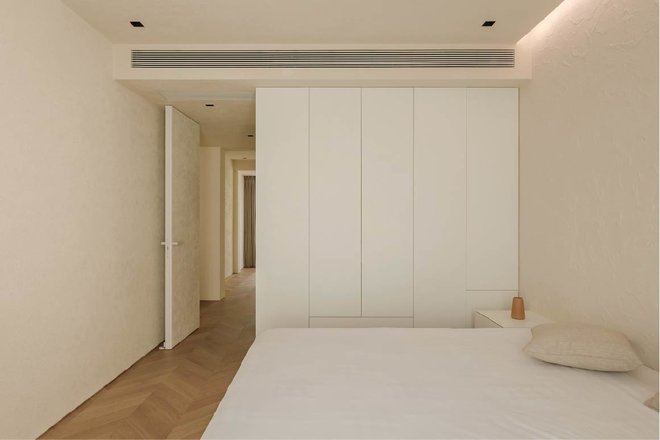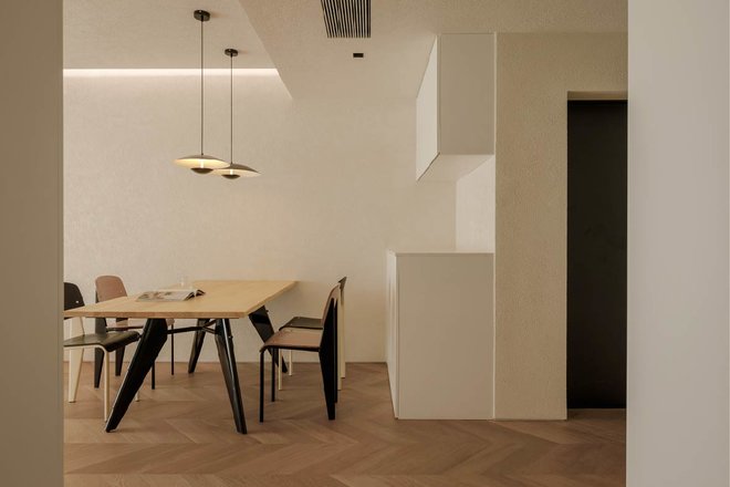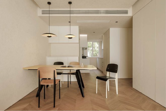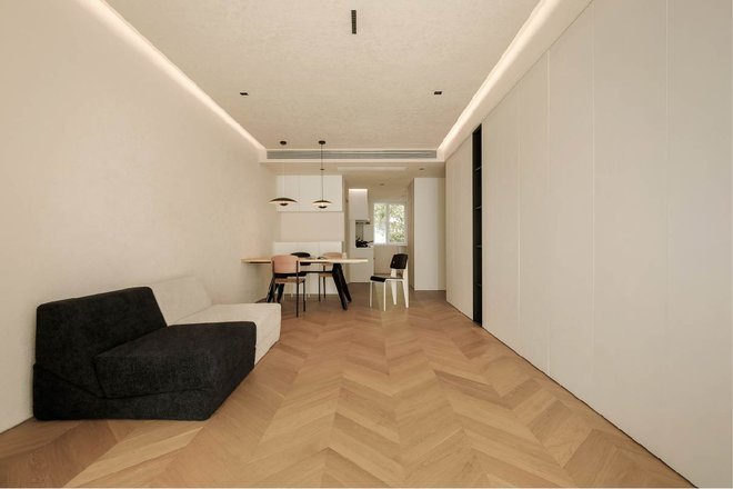 客餐厅一体的设计,顶面,墙面,柜体颜色都采用的是白色调。通过颜色放大了原本狭长的客厅。