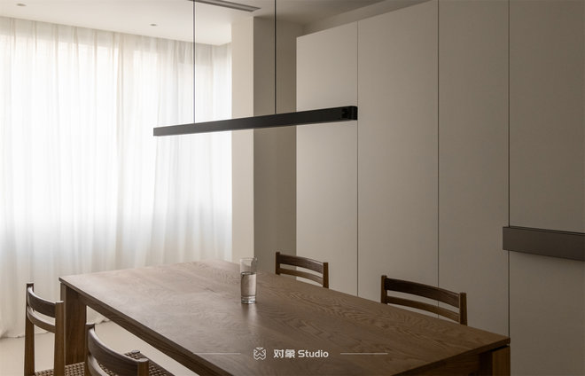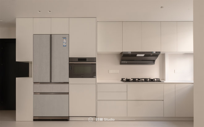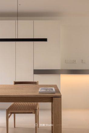 删繁就简,遵从少即是多的原则,没有复杂的坠饰,大平顶无主灯的方式展现一种开阔之感,墙顶都是奶灰色涂料,舍弃了踢脚线,让整个空间过渡的非常流畅自然。