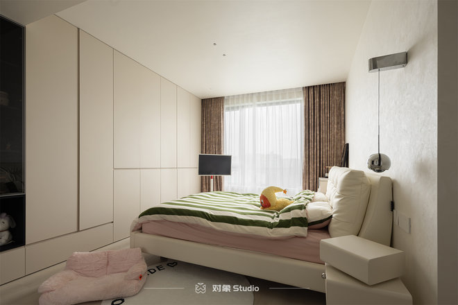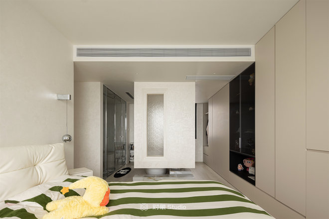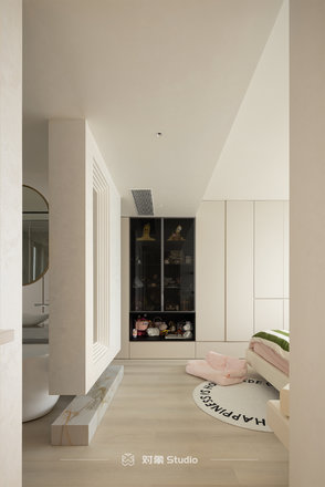 全屋采用无主灯吊顶设计,让整个光线更柔和而富有层次。墙体采用艺术漆,防水、防潮、防霉使墙面立体有质感。