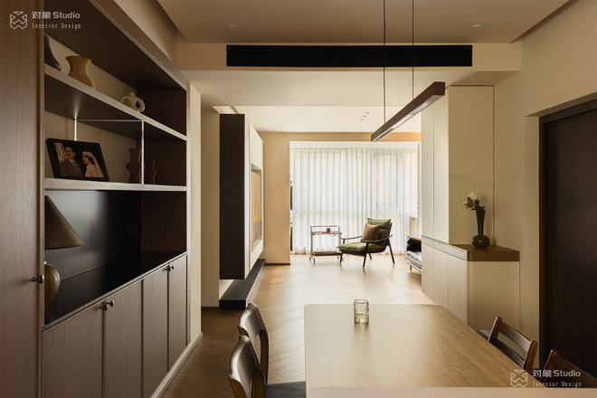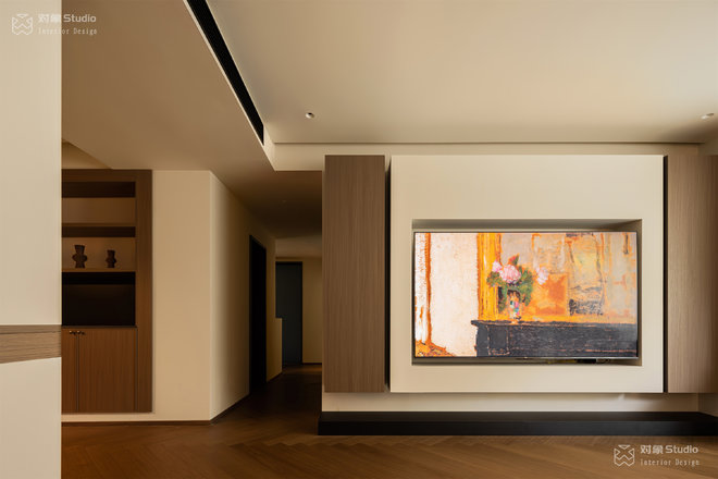 电视背景墙,摒弃整面厚重柜体,采用三段式设计(两侧储物柜 + 中部石膏板/砖饰面),避免呆板。