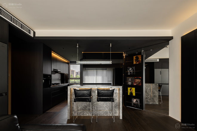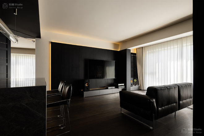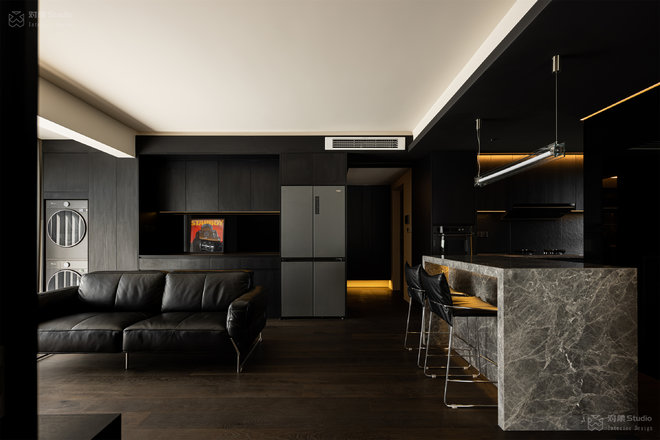 特意收集了多种不同光感的黑色材质:哑光木饰面吞吐着温润的呼吸,高光黑玻璃倒映着理性的秩序,镜面不锈钢则切割出虚实交错的维度。