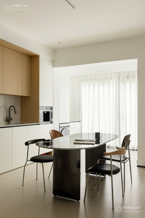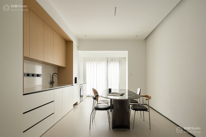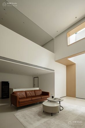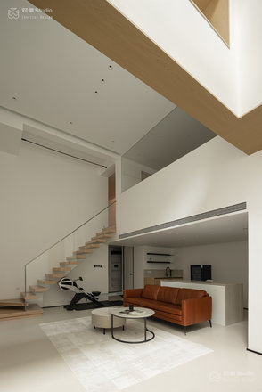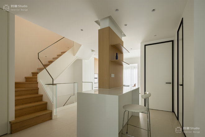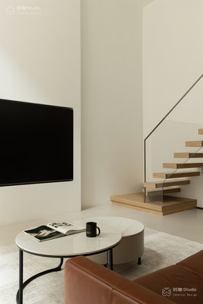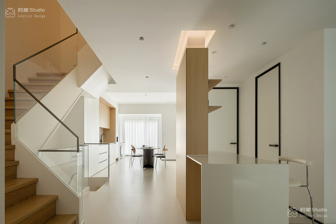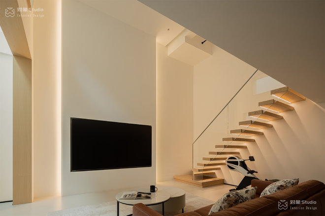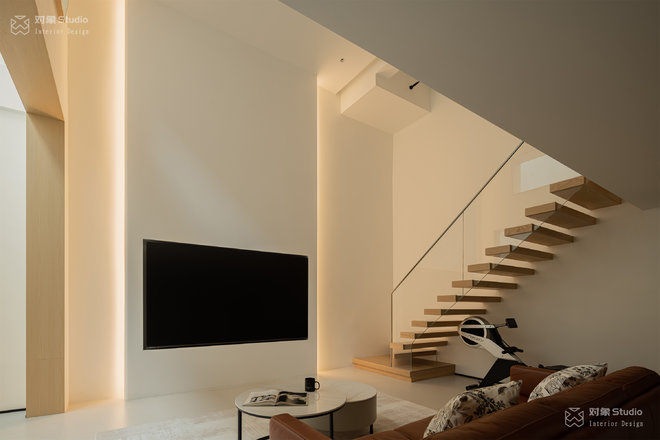 突破传统布局,将楼梯位移以优化入户收纳系统,无主灯设计与悬浮楼梯结构营造出近乎失重的视觉幻象。