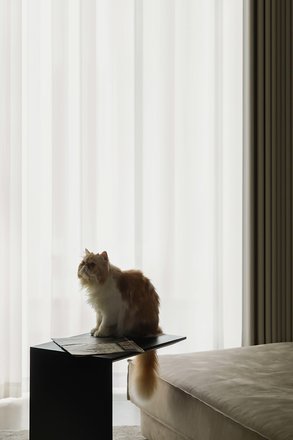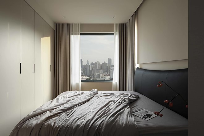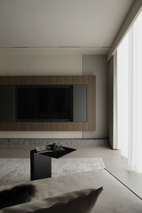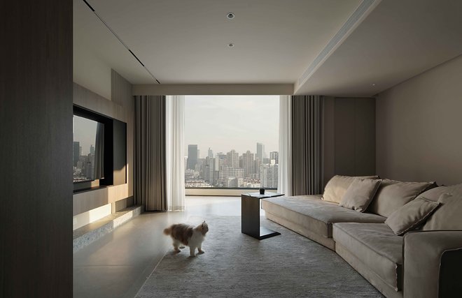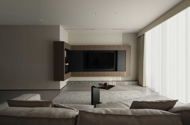 客厅以低饱和度的米灰色为主调,营造出宁静的氛围。宽敞的空间由大面积的落地窗和搭配的浅灰色窗帘与白色纱帘点缀,增加了室内的明亮感