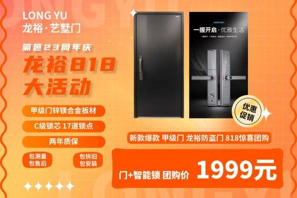 【篱笆23周年 818建材大促】龙裕艺墅门品牌专场团购品牌方上海分公司直接合作,价格非常有诚意新款爆款 甲级门+智能锁1999元起通过篱笆平台报名,还可领取100元管笆会员专用抵用券(爆款可用)